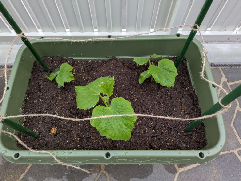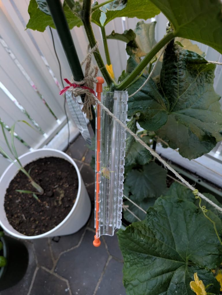 別の株に良い感じにセット出来る9センチの細いキュウリがあったので、容器の中に入れて支柱に結び付けました!