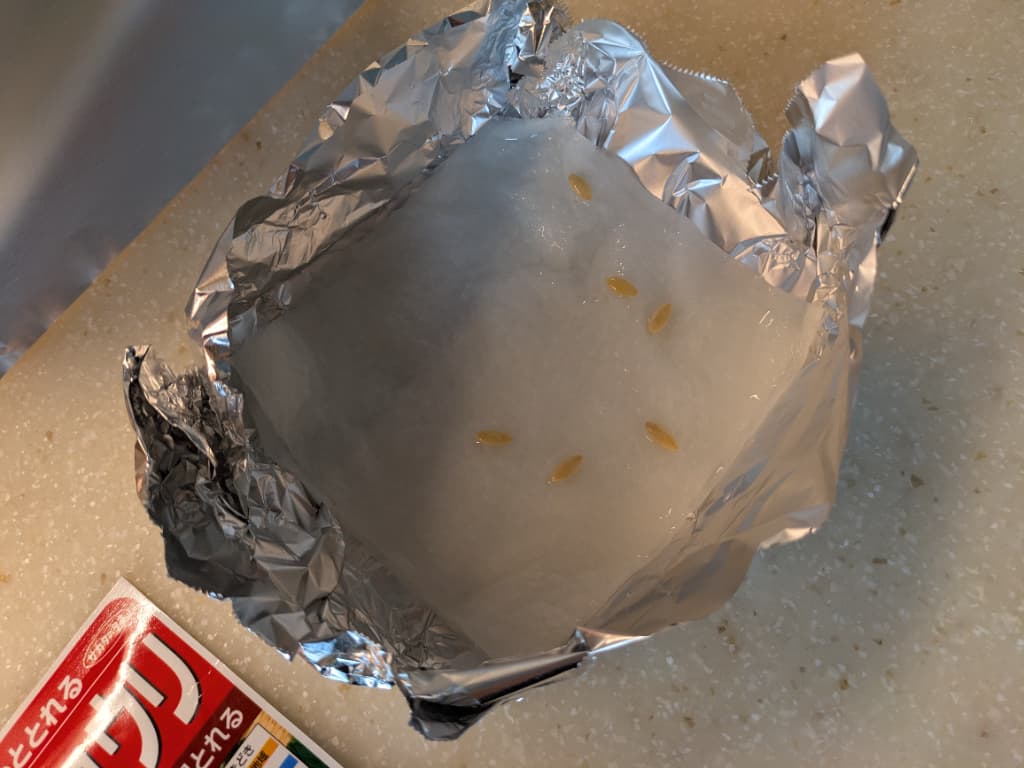 初めてだったので春にほとんどの種子を使ってしまい、6粒しか残っていませんでしたので、6粒全てを蒔いてみました。(例のごとく、アルミホイルにぬるま湯で濡らしたキッチンペーパーを敷き、その上に種子を蒔き、芽が出たら3号ポットに植えます。)