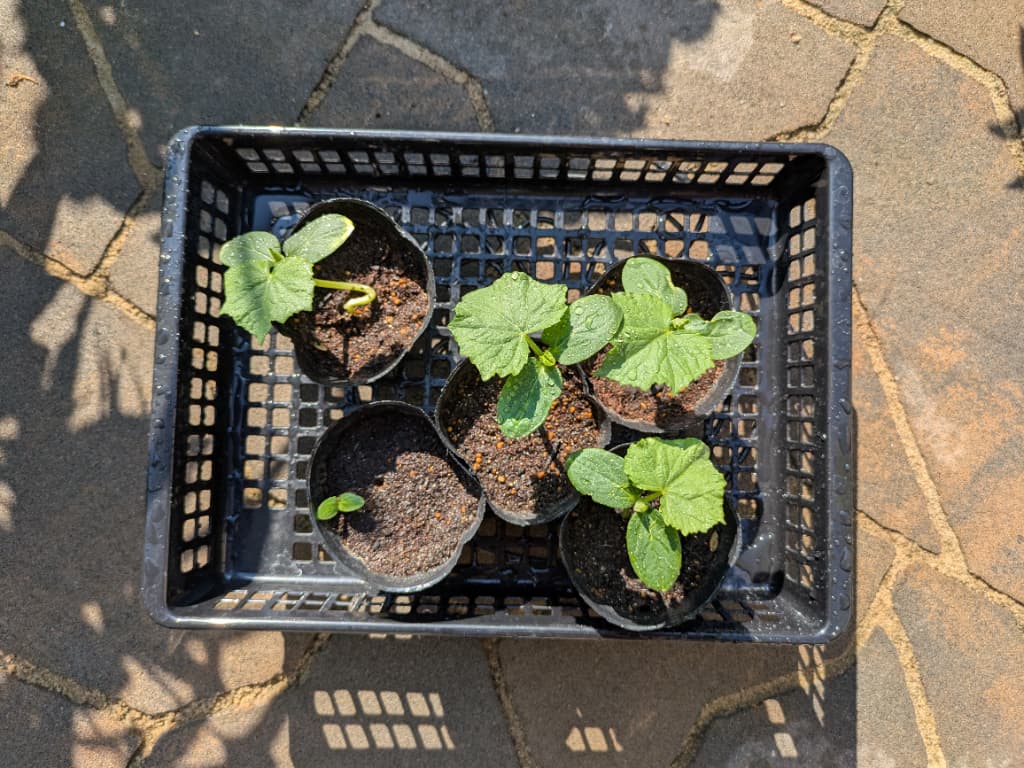 6粒蒔いて、5粒が発芽しました!一応空いているプランターが5個あるので、全て育てます。支柱が足りないかも。