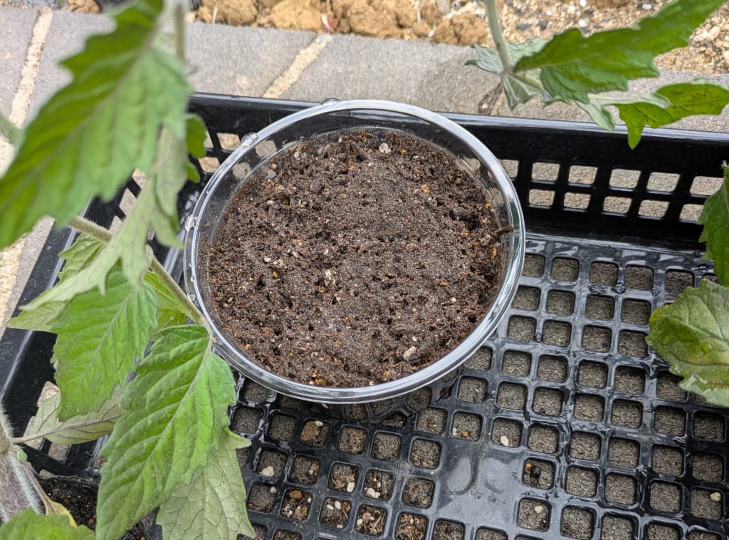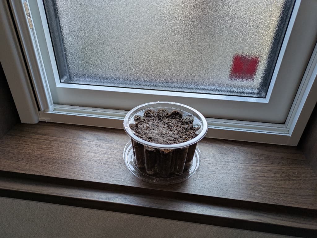 ミニトマトの大容量パックみたいなやつの容器の底に穴をあけて、鉢底石と野菜用の土を入れて種を蒔きました。