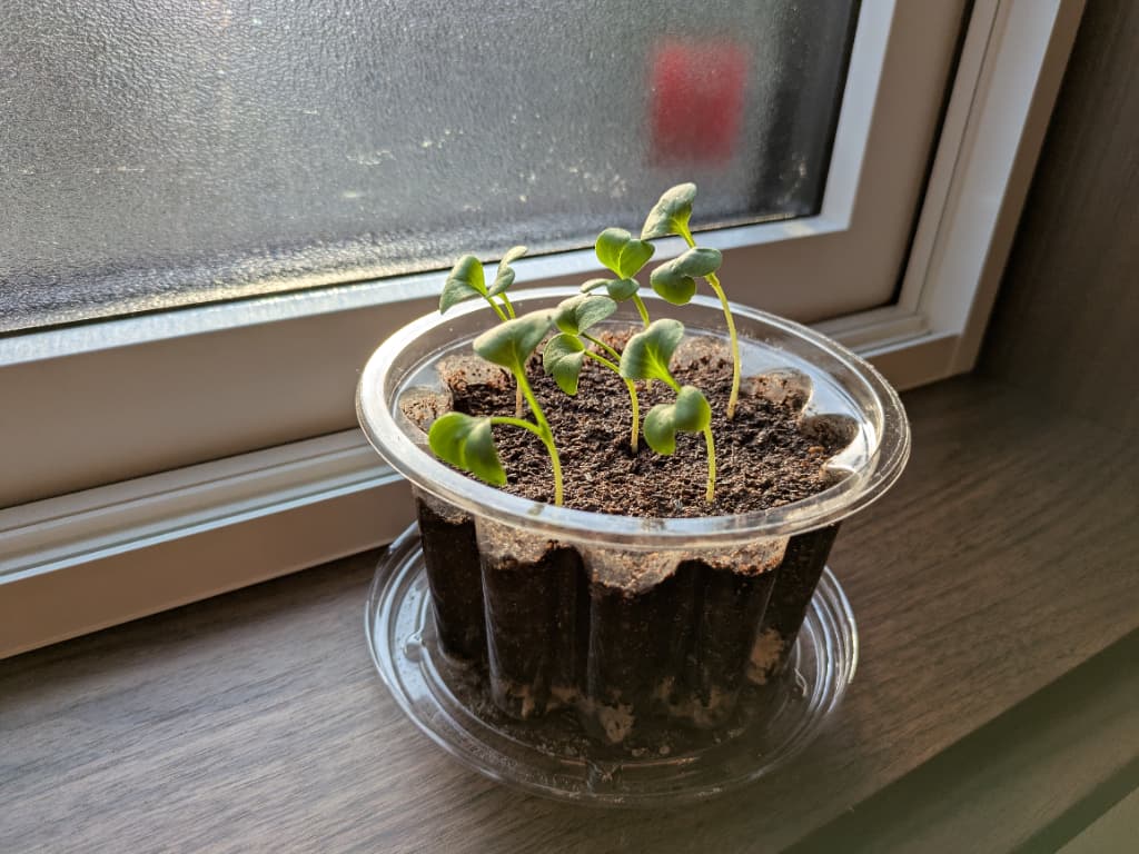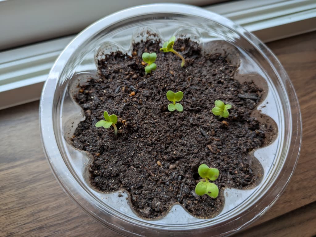 野菜が入っていた容器(プラカップ)でも育つことが分かったので、次はコンビニコーヒーの容器に種まきをして、室内で育ててみることにします。
