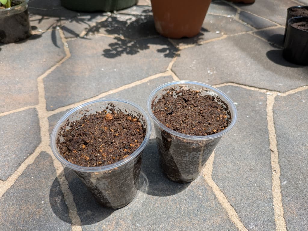 小さいプラカップなので、3つが限界かな?ということで本葉が出始めたらどちらを残すか決めて間引きます。