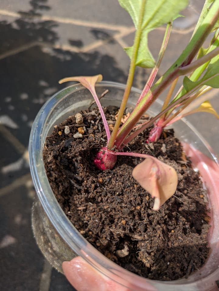 子葉の茎の下半分くらいが赤く膨らむ部分なので、子葉の段階で徒長させないように育てて、本葉が出始めた頃赤くなった部分を土の中に埋める(盛り土的な感じで覆う)というのが非常に重要!