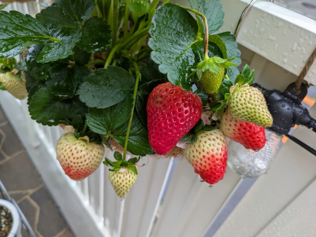 白いちごは4月末に1つ目が取れてから、いくつかの実が膨らみ始めてはうどんこ病になってしまうというのを繰り返していて、結局まだ最初の1粒しか採れていないので、それに比べて順調に実をつけているサントリー本気野菜は本当に病気に強いみたいです。