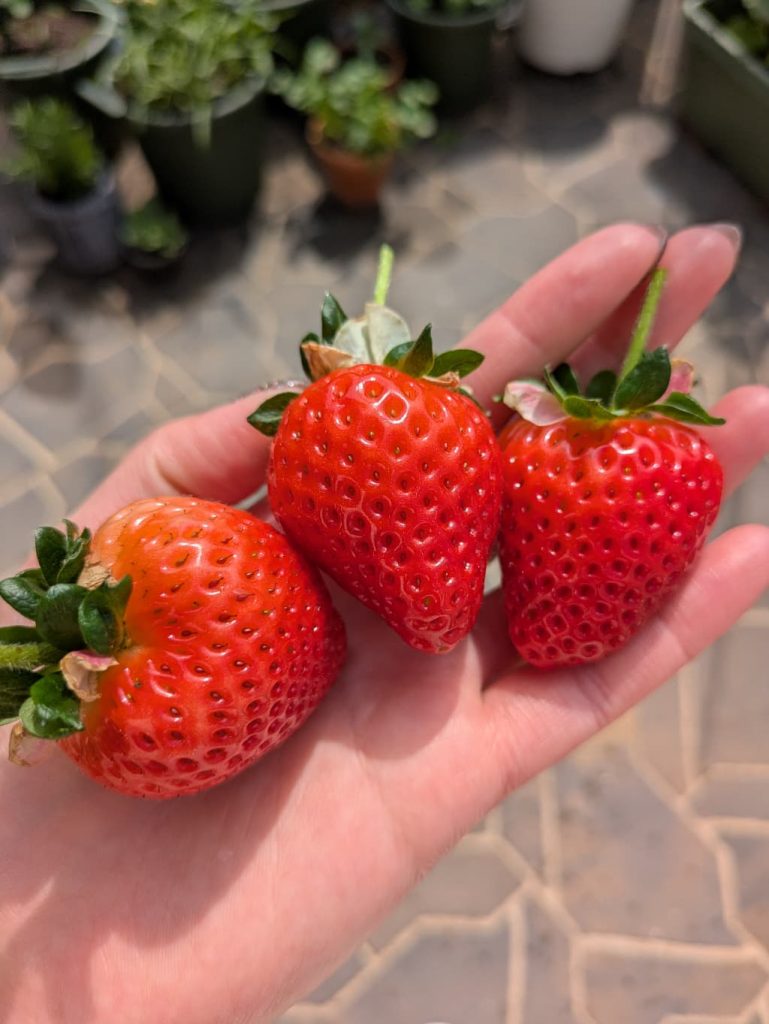 家庭菜園でこんなに大きいイチゴが収穫できるのか~と驚きます。さらに大きいイチゴが1粒赤くなっている途中なので、その収穫も楽しみです🍓