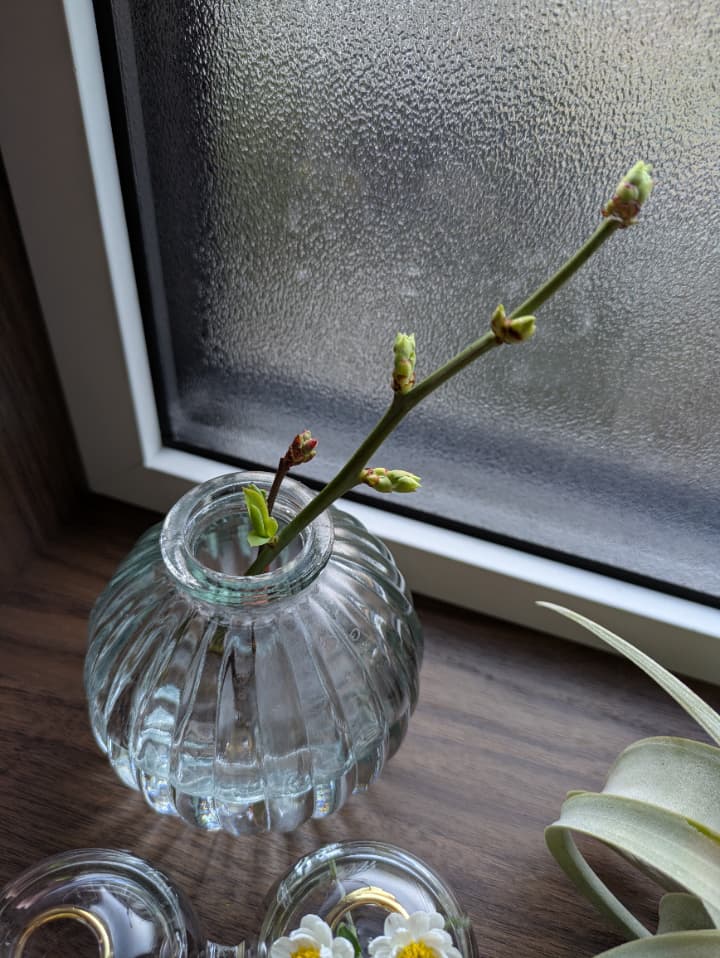 剪定で切り落とした花芽付きの枝を室内の花瓶に挿しておいたら、1個だけ蕾が出来ました!
