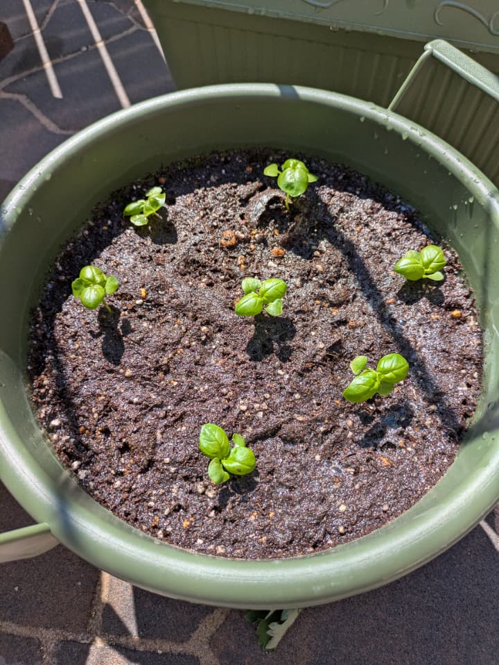 室内で種まきをして数日でたくさん芽が出たので、外の鉢に植えてみました。