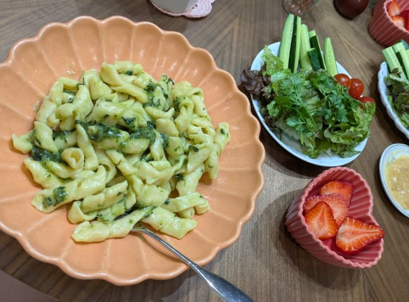 ミキサーが据え置きタイプしか無くて使うのを躊躇ってすり鉢で擦ってジェノベーゼソースを作ったので、ちょっと雑な見た目。サラダに乗っているパクチーとキュウリ、デザートのイチゴもお庭で育ったものです✌