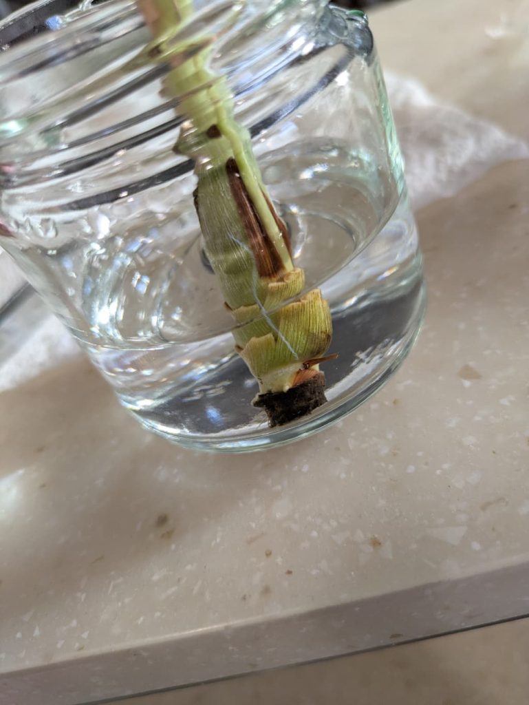 このあと外側の枯れた葉っぱは取り除いて、水に浸けておくことにします。