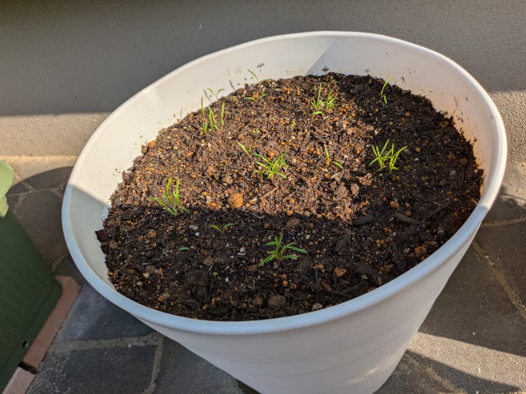 心配だったので、5粒くらいずつ播いて、その周りにも念のためパラパラしておいたら、かなりの数発芽しました。