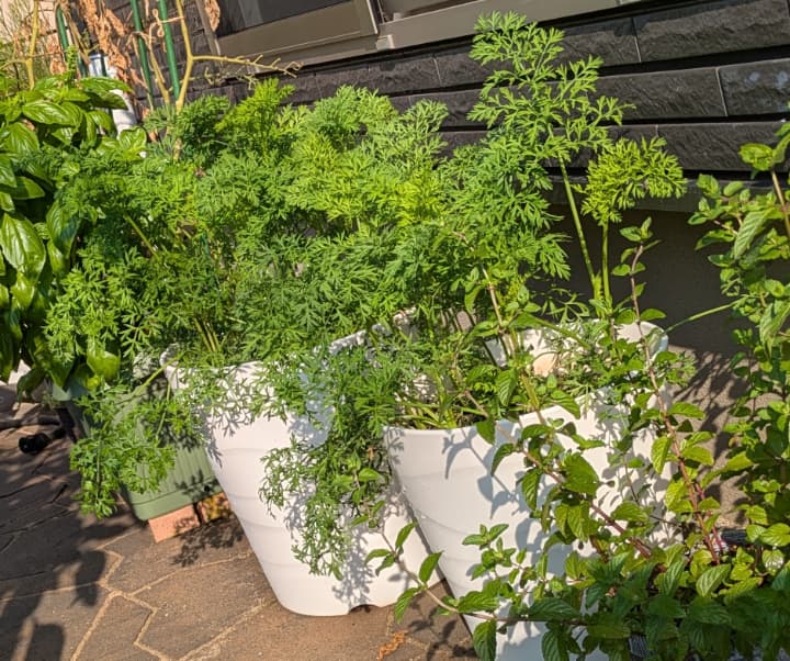 ニンジンなんて何本あってもいいのでたくさん育てたいところですが、我が家のお庭は小さいのでそんなにたくさんは育てられないので、深い鉢2つに播きました!